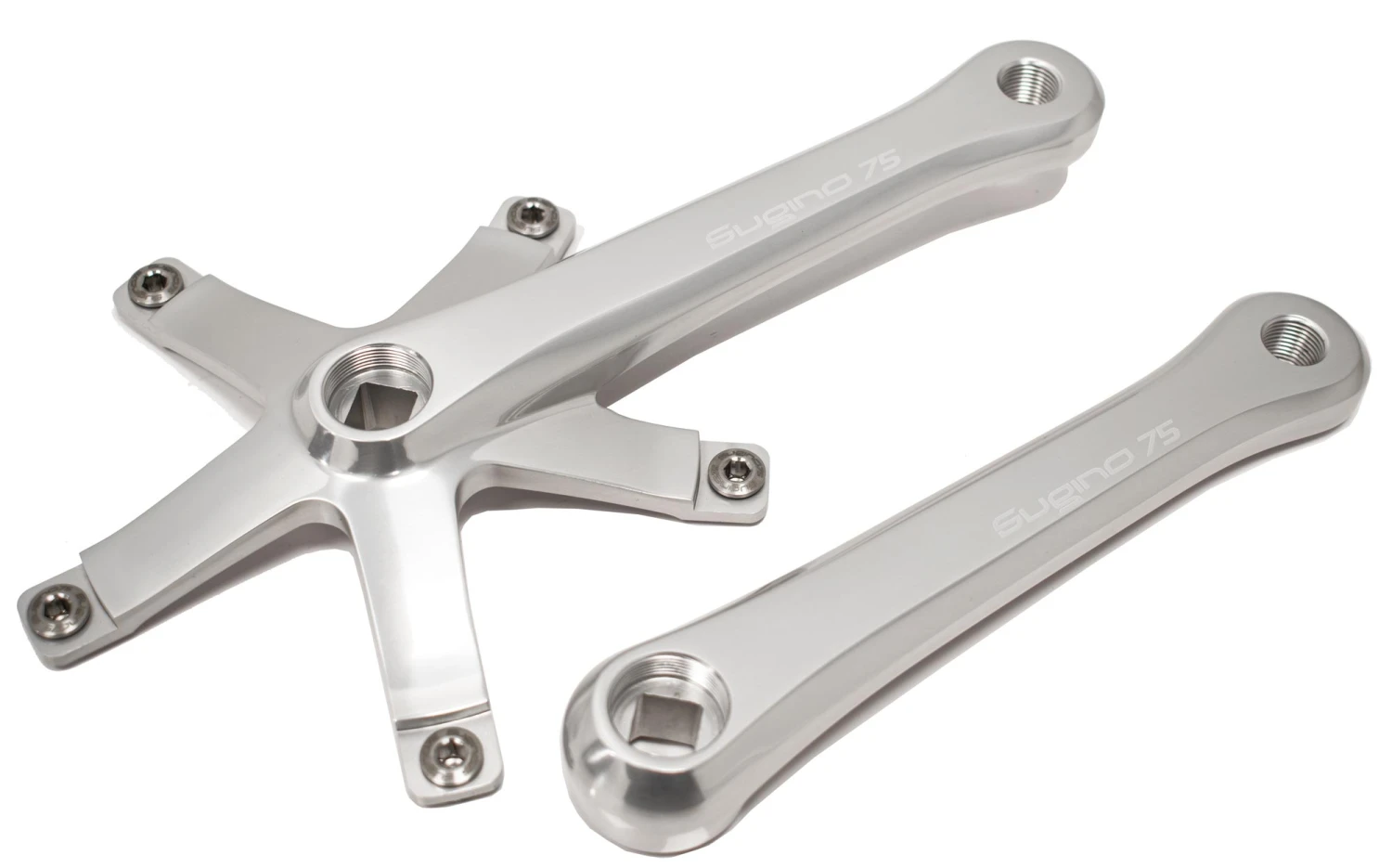 The Sugino 75 cranks are available in arm lengths of 165, 170, 172.5 and 175 mm., and are configured for the contemporary common 144 mm. bolt circle pattern for track chainrings. Silver anodized chainrings to match the finish of the cranks are available in sizes 46 through 53 teeth (1/8″ only).Both arms and chainrings are certified for Keirin (NJS) use. The arms can be installed on either the standard Sugino 75 or “Superlap” bottom brackets